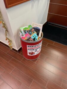 If you’re still interested in donating food this month, please bring items by the Marysville Community Food Bank. Please visit their website for more information: https://www.marysvillefoodbank.org/.