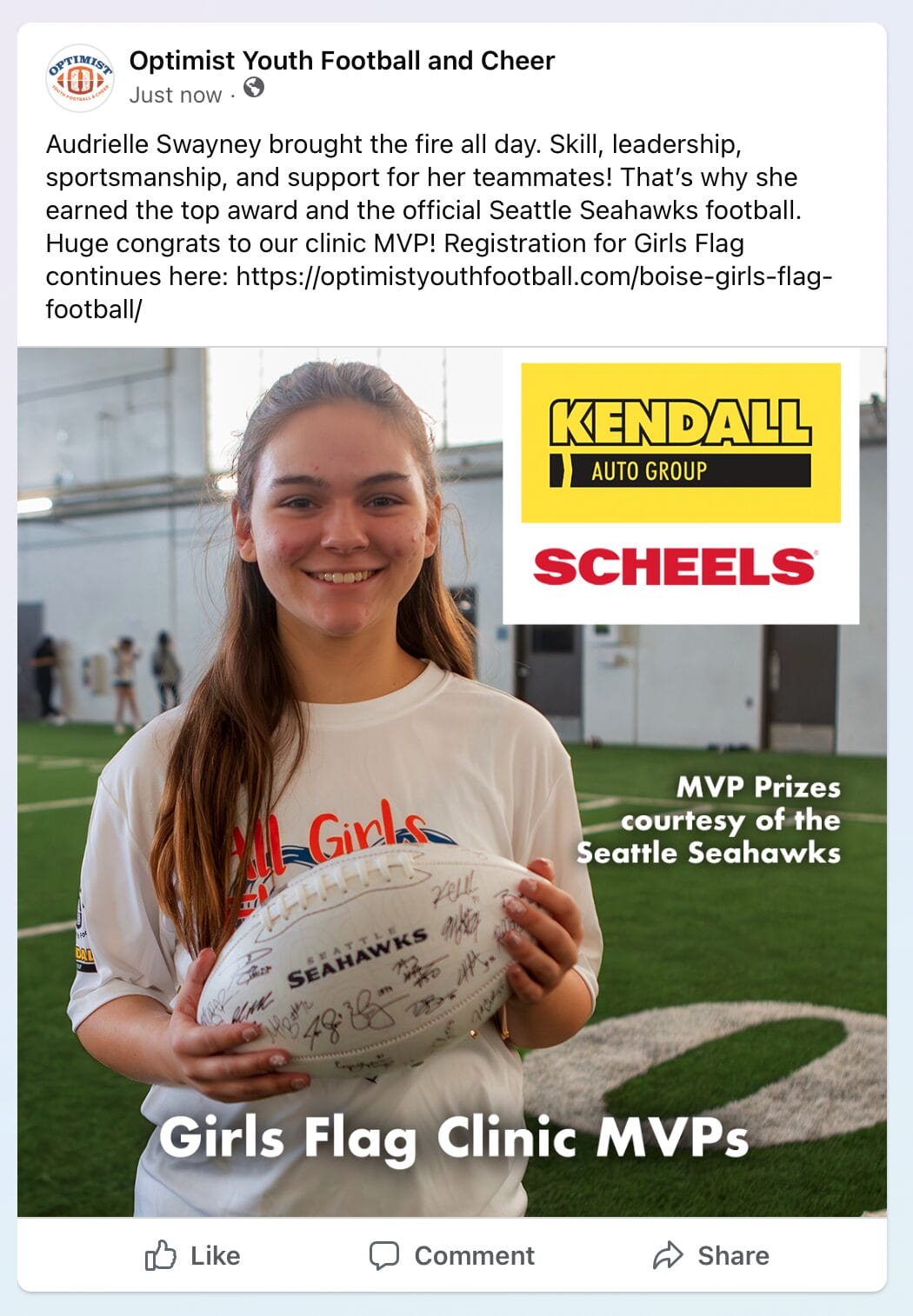 Last Saturday morning, the field at Boise State University was filled with energy, teamwork, and opportunity as more than 90 girls participated in the All-Girls Flag Football Clinic hosted by Optimist Youth Football. Kendall was proud to sponsor this powerful event focused on growing the game and empowering young female athletes.